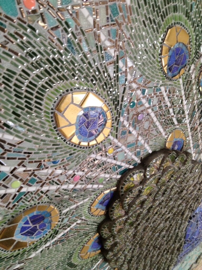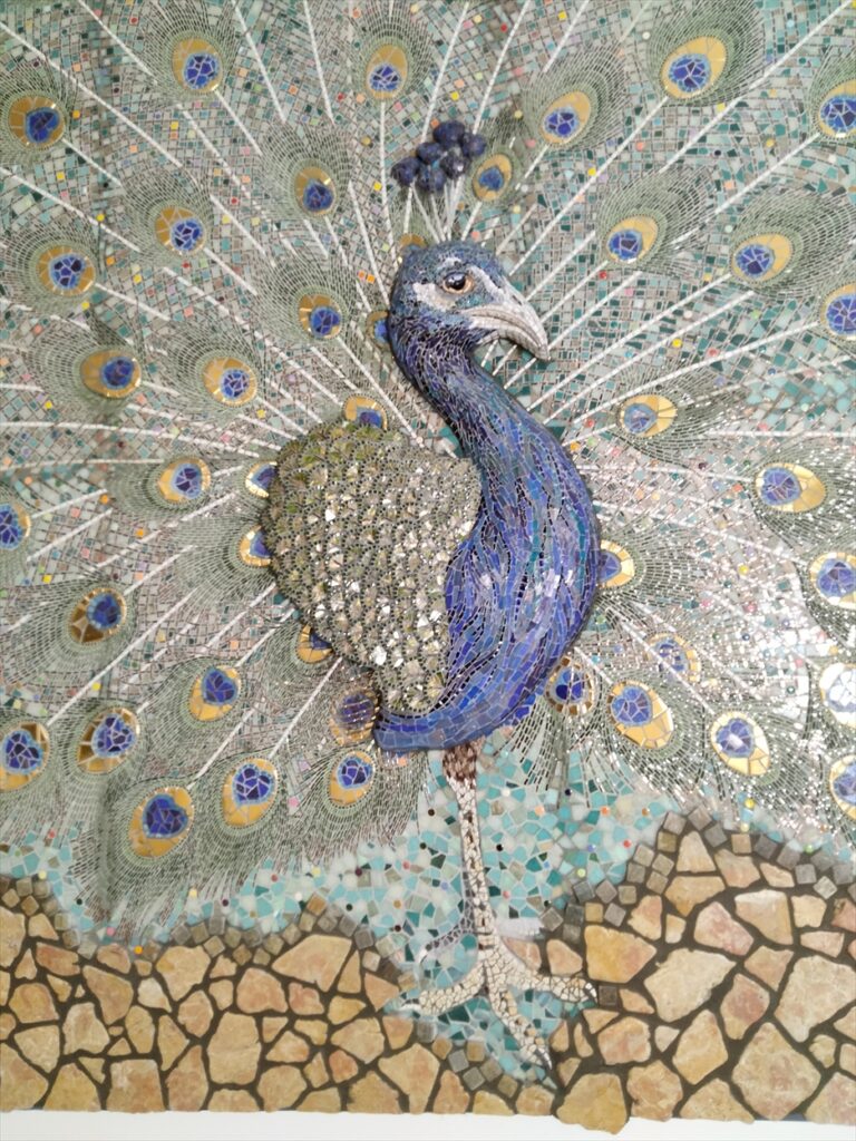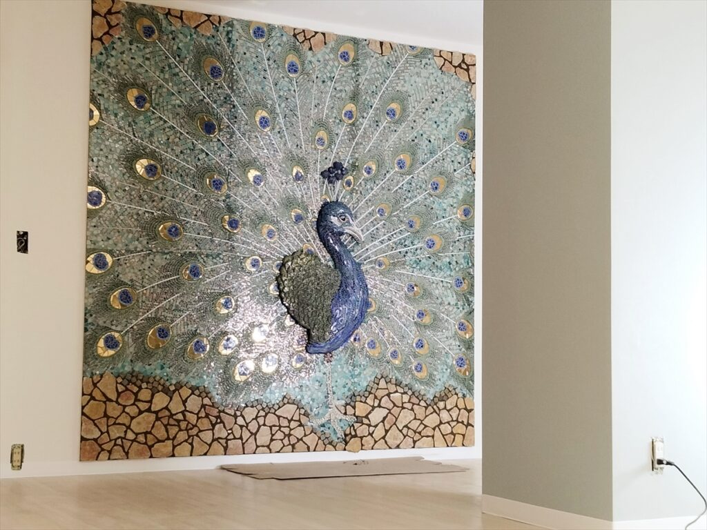 国分寺市の児童館の壁に、クジャクの半立体モザイク壁画を制作しました。